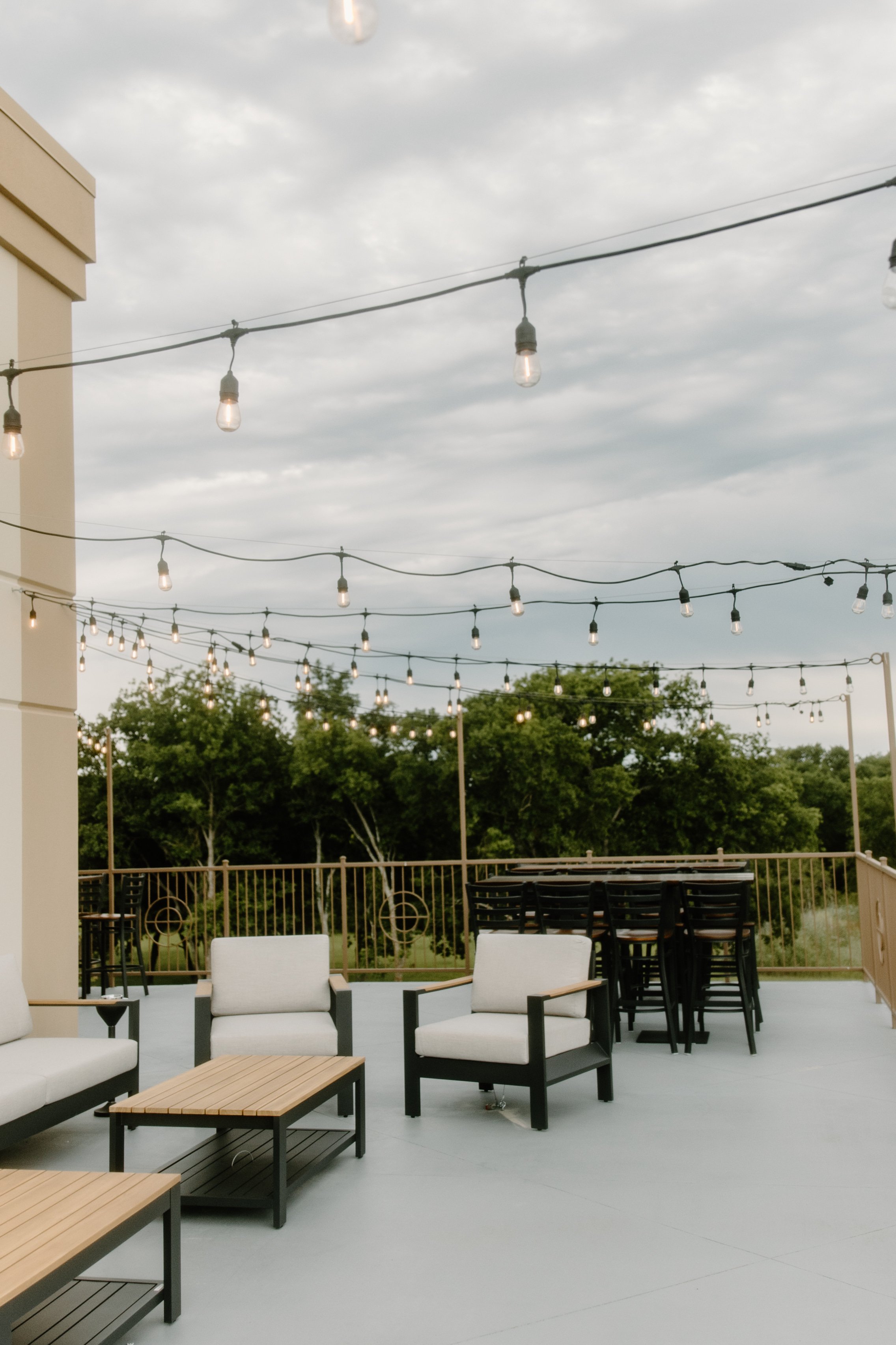 Patio with string lights & lounge seating